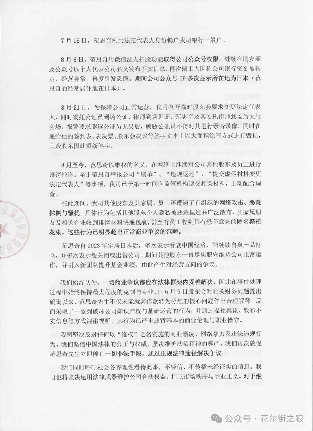 我们始终认为,一切商业争议都应在法律框架内妥善解决,因此在事件处理过程中始终保持最大程度的克制与专业。自6月9日股东会对相关财务问题提出质询以来,范思奇先生不仅未能就其借款转为分红的核心问题作出合理解释,反而采取了一系列破坏公司知识产权与基础运营的行为,并通过操控舆论、散布不实信息等方式混淆视听,其行为已严重违背基本的商业伦理与职业操守。