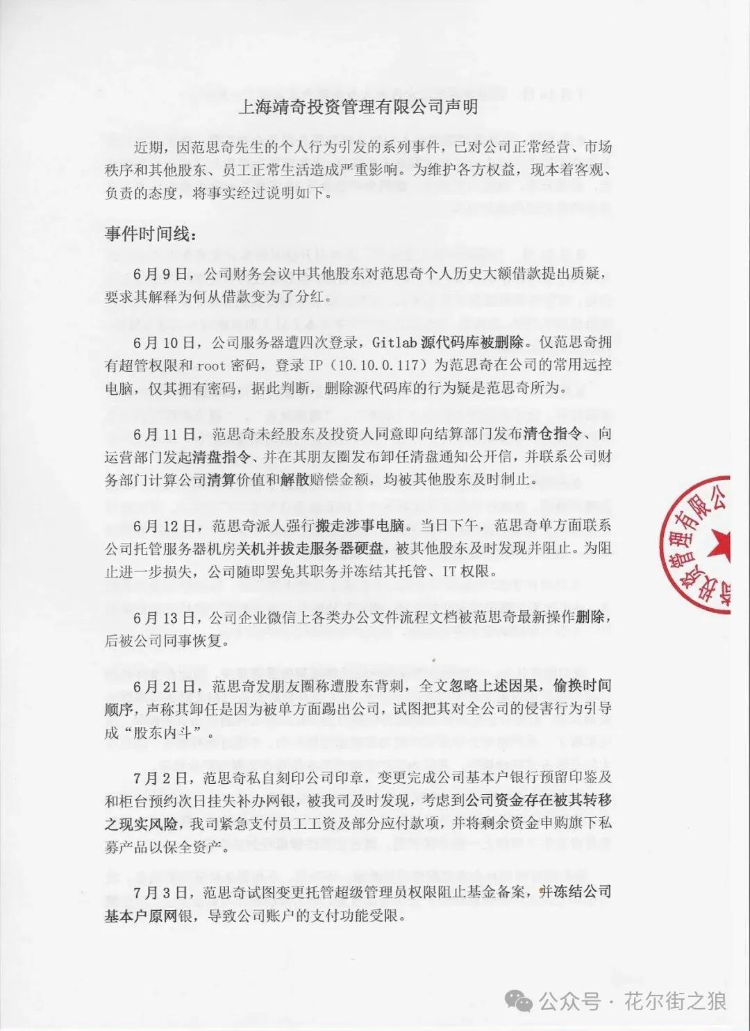 7月2日,范思奇私自刻印公司印章,变更完成公司基本户银行预留印鉴及和柜台预约次日挂失补办网银,被我司及时发现,考虑公司资产存在被其转移之现实风险,我司紧急支付员工工资及部分应付款项并将剩余资金申购旗下私募产品以保全资产。