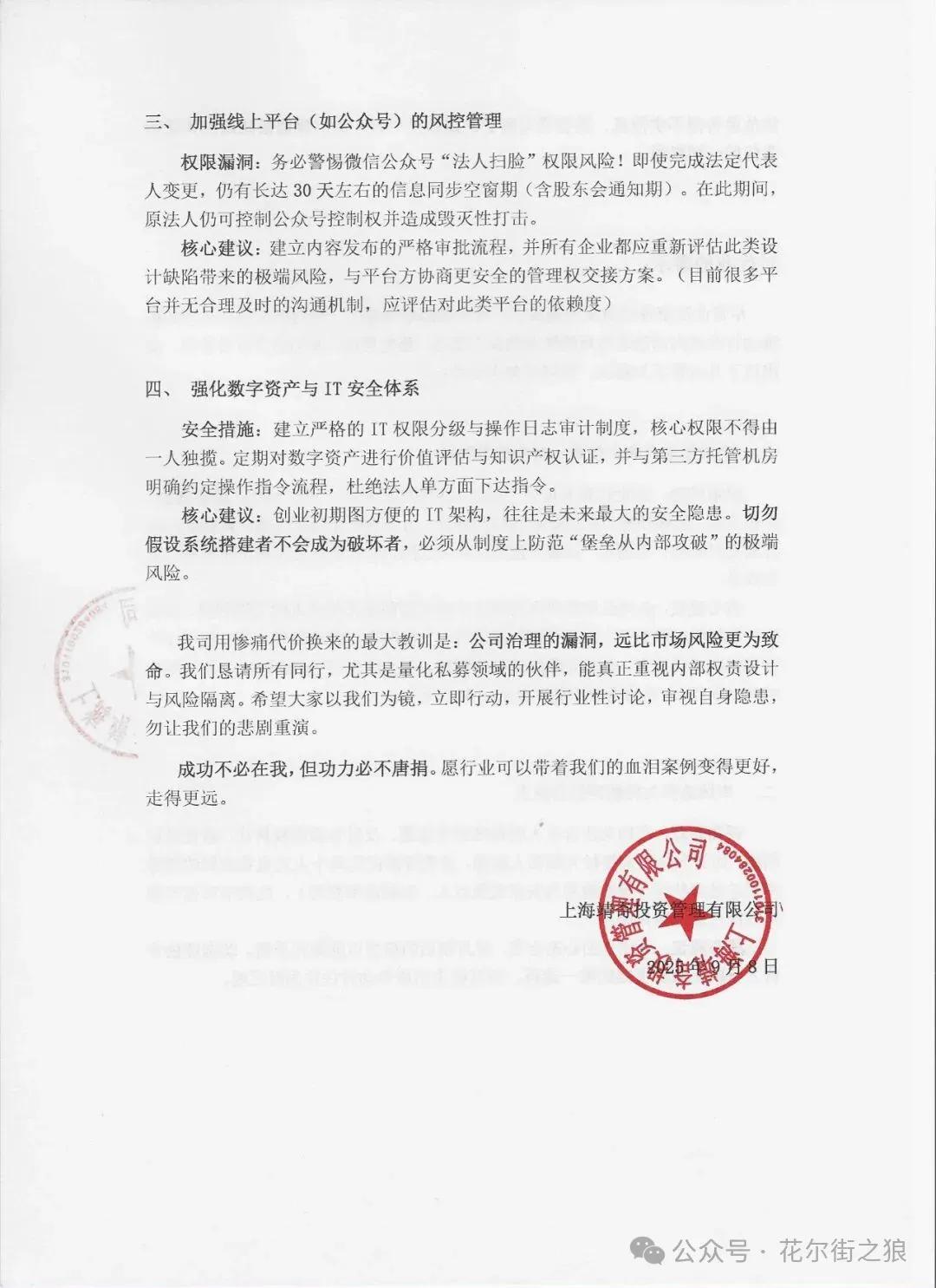 我司用惨痛代价换来的最大教训是:公司治理的漏洞,远比市场风险更为致命。我们恳请所有同行,尤其是量化私募领域的伙伴,能真正重视内部权责设计与风险隔离。希望大家以我们为镜,立即行动,开展行业性讨论,审视自身隐患,勿让我们的悲剧重演。