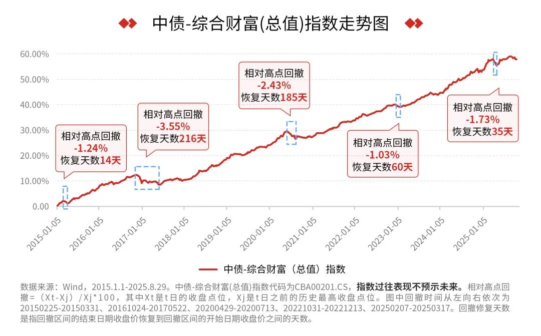 纯债基金以债券为主要投资标的,而债券作为典型的“生息资产”,具备波动低、收益相对稳定的特性,能较好匹配追求稳健的投资需求。尽管今年A股市场表现亮眼,股债“跷跷板”效应下债券资产出现短期回调,但从长期来看,债券仍是低波动资产组合的重要组成部分。以中债-综合财富(总值)指数为例,过去10年间其经历过多次的震荡回调,但每次回调后均能逐步修复,长期向上趋势未改。这意味着,对于风险承受能力较低投资者,可考虑关注纯债基金,在控制波动的同时争取更高收益。